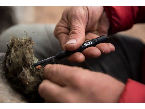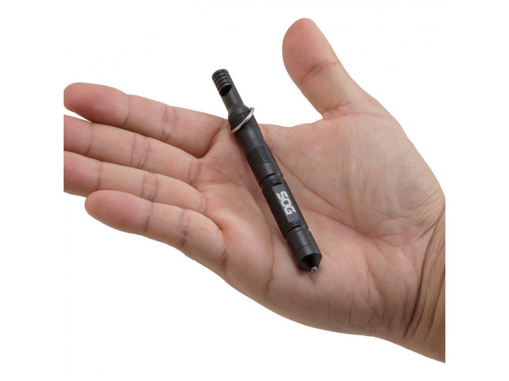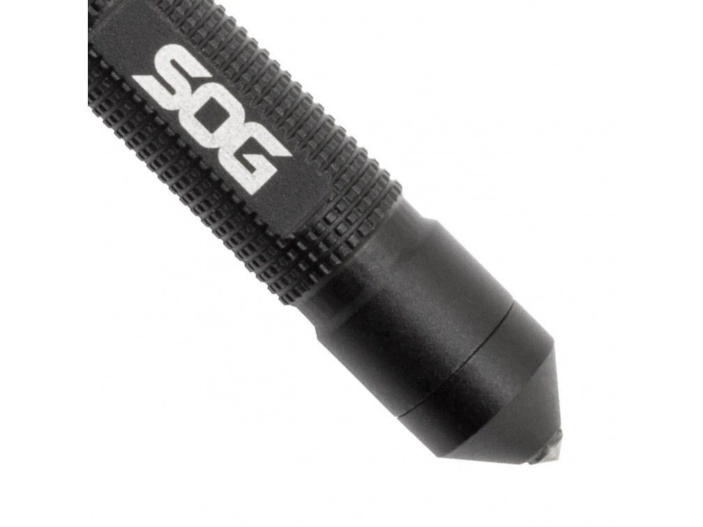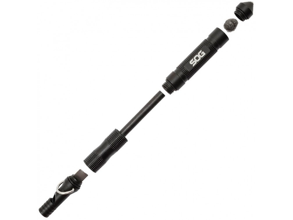 SOG Multi Tool Flint — компактный многофункциональный инструмент американского бренда SOG, который специализируется на производстве высококачественных ножей и инструментов для выживания, туризма и экстремальных условий. Мультитул выполнен из алюминиевого корпуса с черным покрытием и оснащён четырьмя основными функциями: огниво с устройством для розжига из стальной ваты, карабин с кольцом для крепления, аварийный свисток и стеклобой с карбидным наконечником. Общая длина инструмента составляет около 11 см (4,3 дюйма), при этом вес изделия — примерно 39 граммов (0,07 фунта), что делает его лёгким и удобным для ношения на карабине, в кармане или в рюкзаке. Данный мультитул предназначен для использования в экстренных ситуациях, выживании и активном отдыхе, где важна компактность и надежность инструментов для розжига огня, подачи сигналов и разбивания стекла.