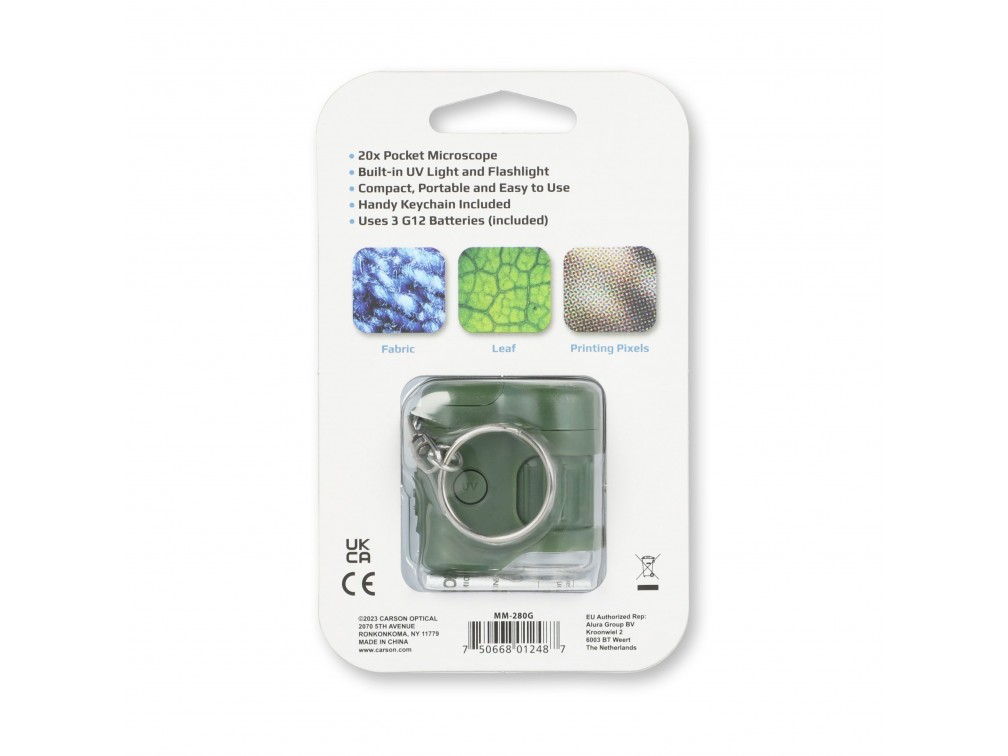 MM-280G (Зеленый) MicroMini - это 20-кратный карманный микроскоп с подсветкой, всегда готовый к использованию! Он компактен, портативен и прост в использовании. Настолько мал, что помещается в ладони руки. Его можно прикрепить к любой сумке или рюкзаку с помощью встроенного брелока. Теперь вы можете исследовать что угодно... где угодно, используя светодиодный фонарик! Просматривайте ткани, цветы, листву, пиксели печати и многое другое вблизи! С помощью включенного УФ-света можно рассмотреть скрытые объекты в валюте.
