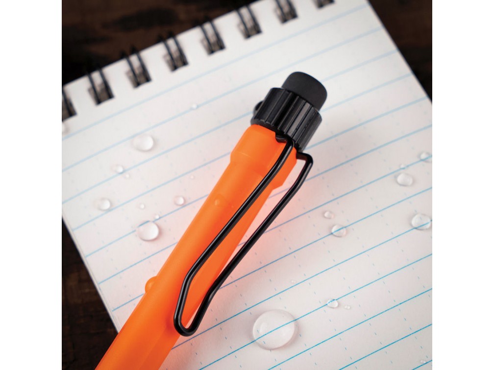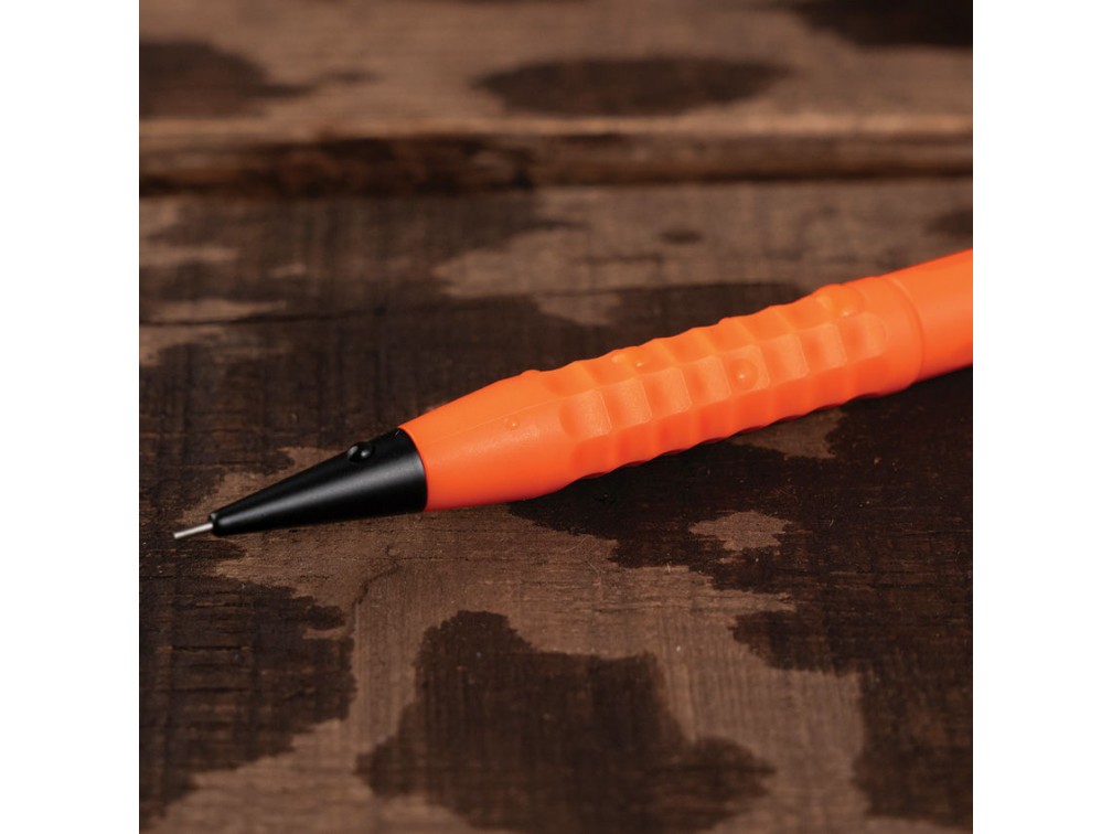 Precision Twist Pencil — механический карандаш от американского бренда Rite in the Rain, специализирующегося на влагозащитных пишущих инструментах. Корпус выполнен из ударопрочного ABS-пластика с металлическими элементами, что обеспечивает высокую устойчивость к повреждениям, влаге и загрязнениям. Механизм подачи грифеля реализован в виде надёжного поворотного узла Twist Advance, позволяющего точно выдвигать и втягивать стержень. Грифель толщиной 0,9 мм (твёрдость HB) подходит для записей на любой поверхности, в том числе на водостойкой бумаге. Задняя часть корпуса снабжена ластиком и отсеком для хранения до 12 запасных грифелей. Металлическая клипса позволяет надёжно крепить карандаш к блокноту, одежде или рюкзаку. Длина карандаша составляет около 14,5 см, диаметр корпуса — примерно 1,2 см, вес — около 28 граммов. Благодаря прочной конструкции, влагостойкости и удобству в использовании, этот карандаш отлично подходит для работы в полевых условиях, на стройке, в походах и других экстремальных ситуациях. Сделано в США.