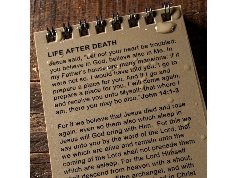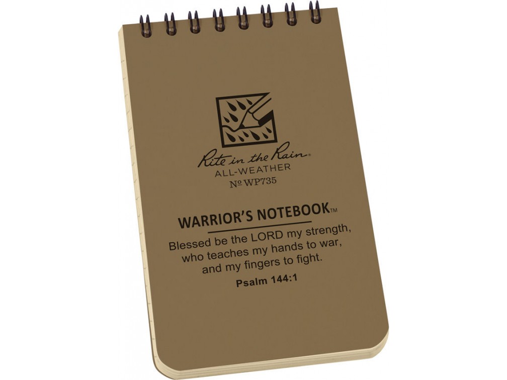 Warrior’s Notebook — надёжный тактический записной блокнот от американского бренда Rite in the Rain, предназначенный для использования в полевых условиях и экстремальной погоде. Обложка выполнена из прочного материала Polydura толщиной примерно 0,48 мм (19 gauge), устойчивого к загрязнениям и износу. Блокнот имеет проволочный переплёт Wire-O, устойчивый к деформации при встряхиваниях и транспортировке. Всего 114 страниц (57 листов) из влагостойкой бумаги весом 20 lb, пригодной для записей под дождём, в грязи, с мокрыми руками и в условиях низкой освещённости. Размер одной страницы составляет примерно 3" × 5", общий размер блокнота — около 7,6 × 13,3 × 1 см, вес составляет около 0,06 кг. Каждая страница содержит универсальный шаблон (Universal Pattern); внутри обложки размещены имперский и метрический масштабы, а также 11 свайп-страниц с библейскими стихами. Блокнот предназначен для военных, спасателей, туристов и профессионалов, которым важно сохранять записи в любых условиях. Сделано в США.