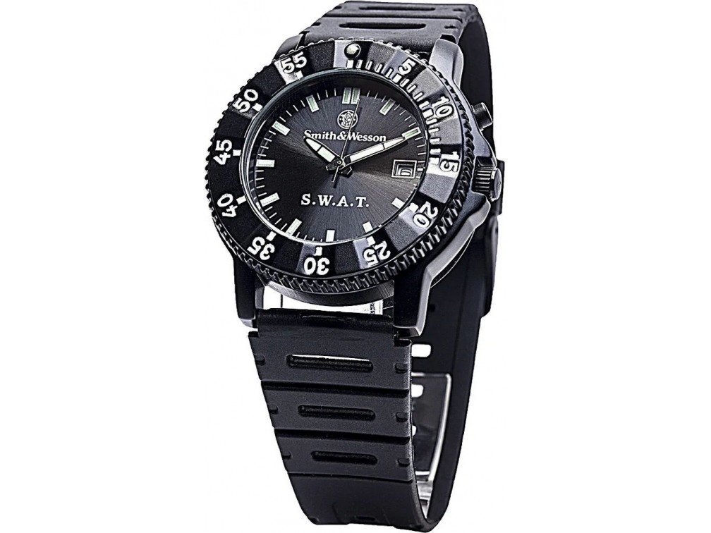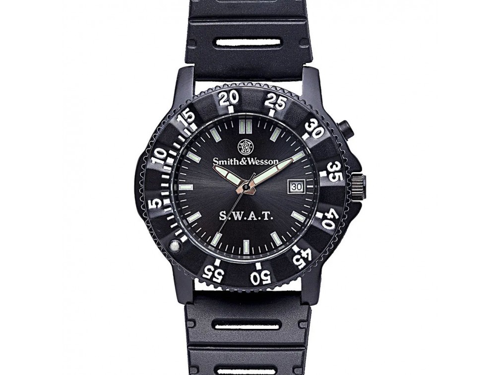 Smith & Wesson Firearms Co. — легенда американского оружейного рынка. Компания знаменита производством надежных револьверов. Производство расположено в Спрингфилде, штат Массачусетс, и основано в 1852 году Хорасом Смитом и Д. Б. Вессоном. С 1860 года оружие Smith & Wesson начало поставляться в Российскую империю. В настоящее время помимо огнестрельного оружия Смит и Вессон выпускает широкий спектр оружейных и тактических аксессуаров. Тактические часы S&W SWAT Watch выполнены в стиле классических военных часов. Диаметр корпуса – 40 мм. Высота – 13 мм. Дополнительная функция – дата. Активная и люминесцентная виды подсветки. Точность хода обеспечивается практичным японским кварцевым механизмом. Водозащита – 30 м. Минеральное стекло. Покрытие – Black.
