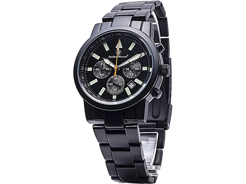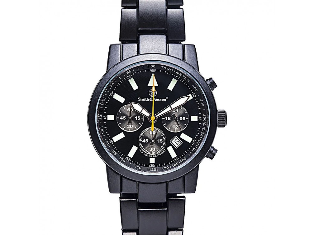 Smith & Wesson Firearms Co. — легенда американского оружейного рынка. Компания знаменита производством надежных револьверов. Производство расположено в Спрингфилде, штат Массачусетс, и основано в 1852 году Хорасом Смитом и Д. Б. Вессоном. С 1860 года оружие Smith & Wesson начало поставляться в Российскую империю. В настоящее время помимо огнестрельного оружия Смит и Вессон выпускает широкий спектр оружейных и тактических аксессуаров. Тактические часы S&W Pilot Watch выполнены в стиле классических пилотских часов. Снабжены хронографом и тахимитрической шкалой. Люминесцентная подсветка. Диаметр корпуса – 39 мм. Высота – 11 мм. Дополнительная функция – дата. Точность хода обеспечивается практичным японским кварцевым механизмом. Водозащита – 30 м. Минеральное стекло. Покрытие – Black.