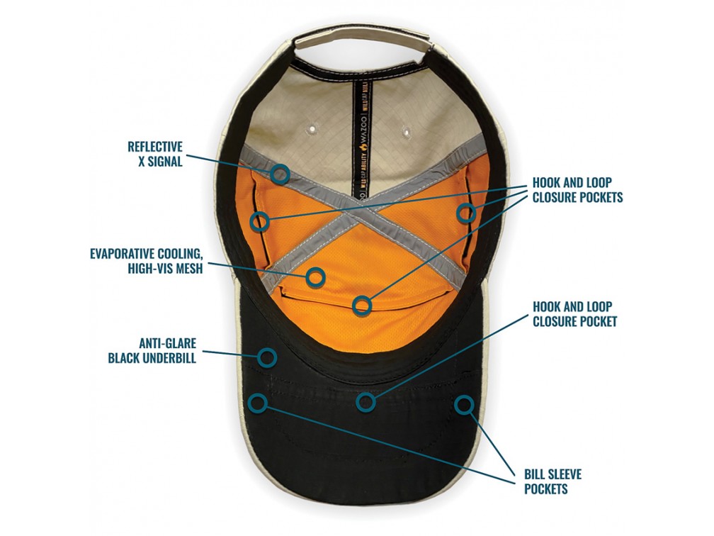 Размер кепки универсален и подходит для обхвата головы от 17 см до 20 см. Размеры карманов: центральный карман купола — 12.7 см ширина x 11.43 см длина, боковые карманы купола — 7.62 см ширина x 12.7 см длина, центральный карман козырька — 13.34 см ширина x 3.81 см длина, узкие карманы — 1.9 см ширина.