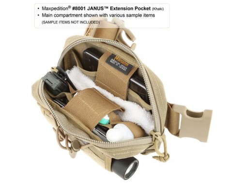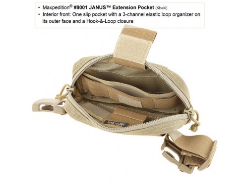 Оригинальный подсумок Maxpedition Janus отличается возможностью крепления на двухдюймовый ремень плечевых сумок Maxpedition. Подсумок встраивается в ремень при помощи фастексов и удлиняет его. Возможно использование как под правую, так и под левую руку. Также при необходимости вставку для ремня можно снять и подсумок можно навешивать на снаряжение при помощи строп MOLLE. Внутри подсумок имеет удобную организацию с карманами и эластичной стропой, что позволяет разместить мелкие предметы. В передней части подсумка имеется эластичный трос, которым можно закрепить на подсумке предметы, к которым нужен быстрый доступ.