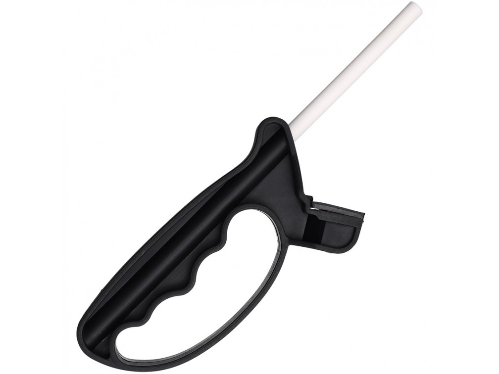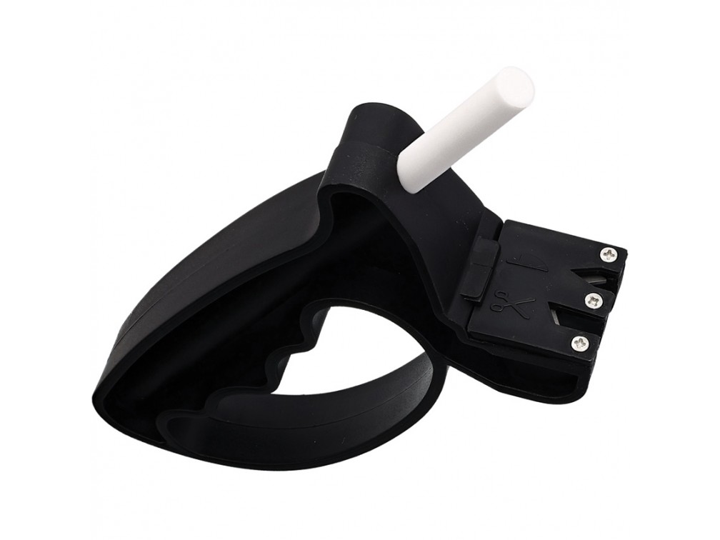 Точилка оснащена черной пластиковой рукояткой и встроенным выдвижным керамическим штоком для заточки, который обеспечивает удобство и безопасность в использовании. Кроме того, в конструкцию включены двойные карбидные элементы для заточки как ножниц, так и ножей, что делает её универсальной для работы с разнообразными инструментами.
