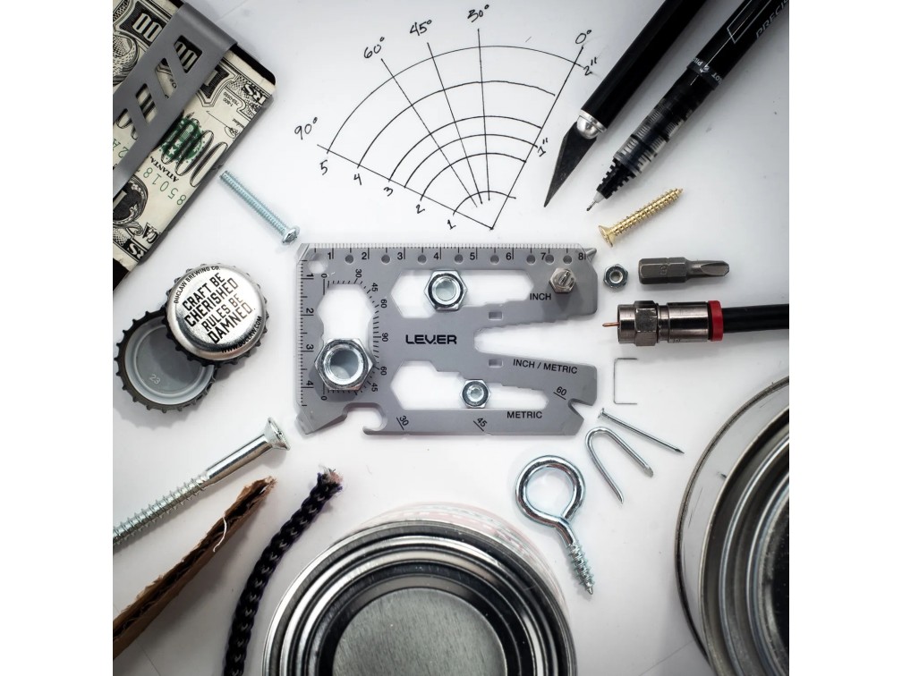 Когда вы вне дома, у вас не всегда есть время идти за инструментами. Традиционные мультитулы громоздки и тяжелы. Lever Gear Toolcard Pro объединяет 40 инструментов в мультитуле размером с кредитную карту, чтобы вы могли моментально решать повседневные задачи - открывать коробки, затягивать винты или болты, поднимать, измерять, резать шнуры, открывать бутылки и многое другое.