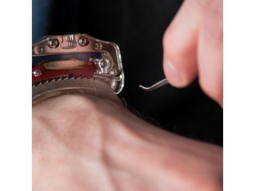 Тренировочные наручники выполнены из прозрачного акрила, а подвижные части замка из окрашенного пластика, что облегчает понимание принципов работы наручников. В комплекте ключ.